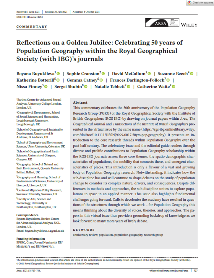 In November 2021, the Population Geography Research Group of the Royal Geographical Society with Institute of British Geographers celebrated its 50th birthday through an event exploring the (hi)stories of population geography. We were delighted to discuss these histories with James Esson Sarah Marie Hall, Phil Rees, George Tan and Brenda Yeoh, as well as with the event audience.